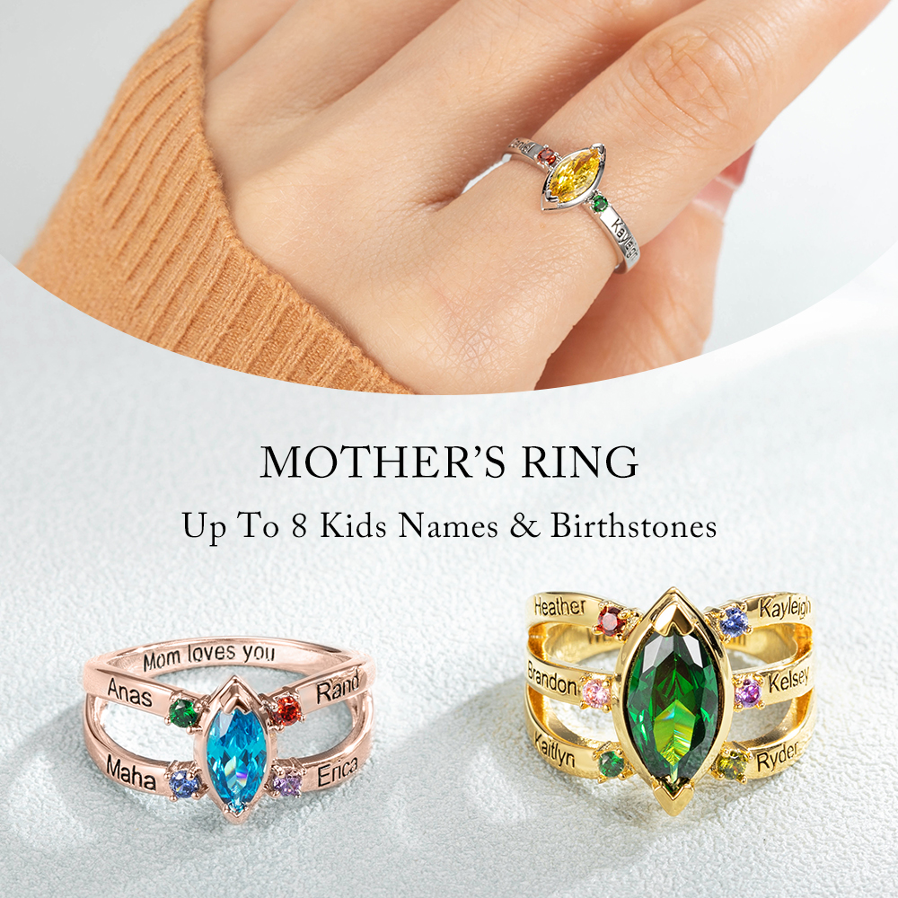 Personalized Gift -  This marquise-shaped ring is a beautiful and personalized piece of jewelry that makes an ideal family gift, especially for mothers and grandmothers. It can be customized with 1-8 names and tiny birthstones. Each birthstone represents a loved one in the family, and their name can be engraved beside the birthstone.