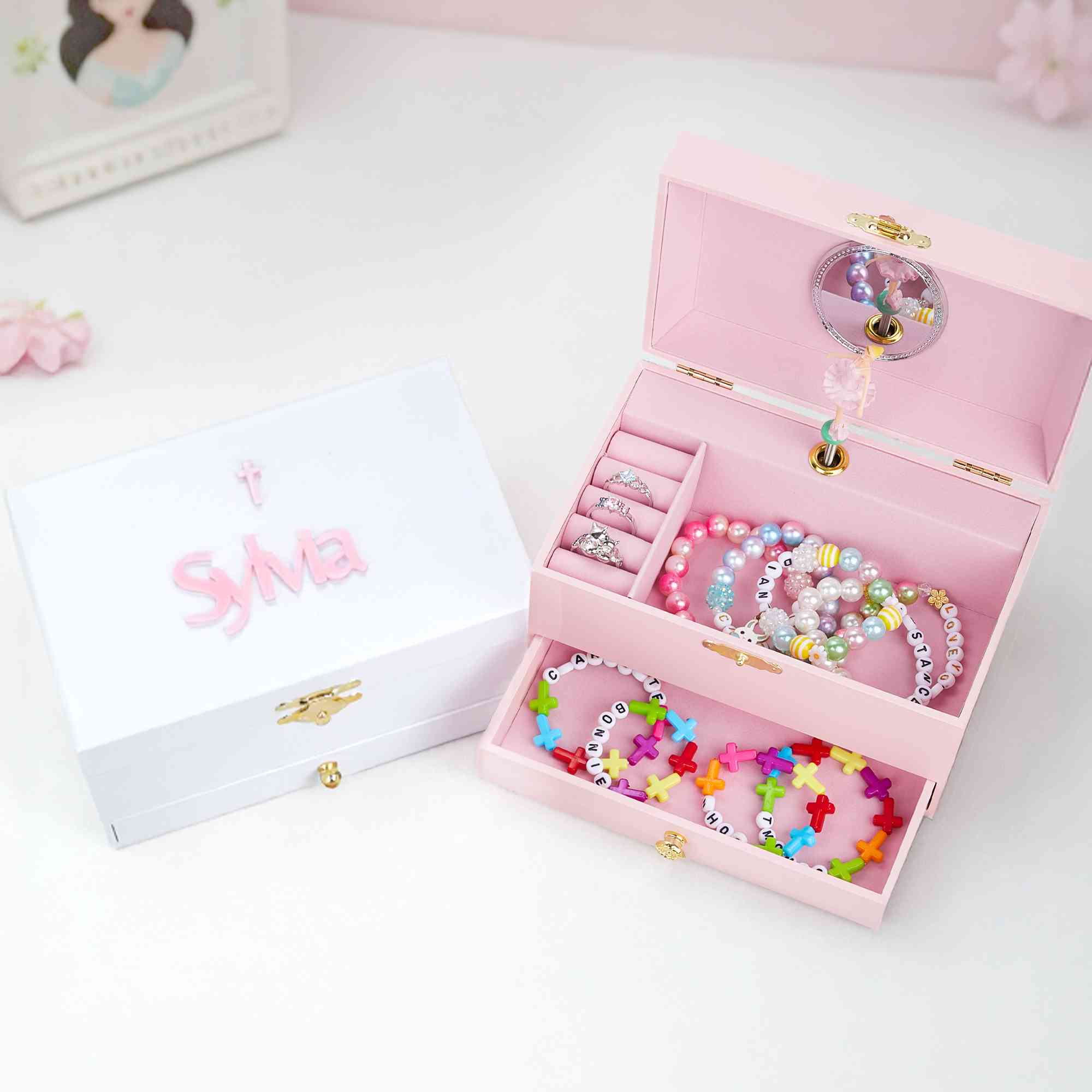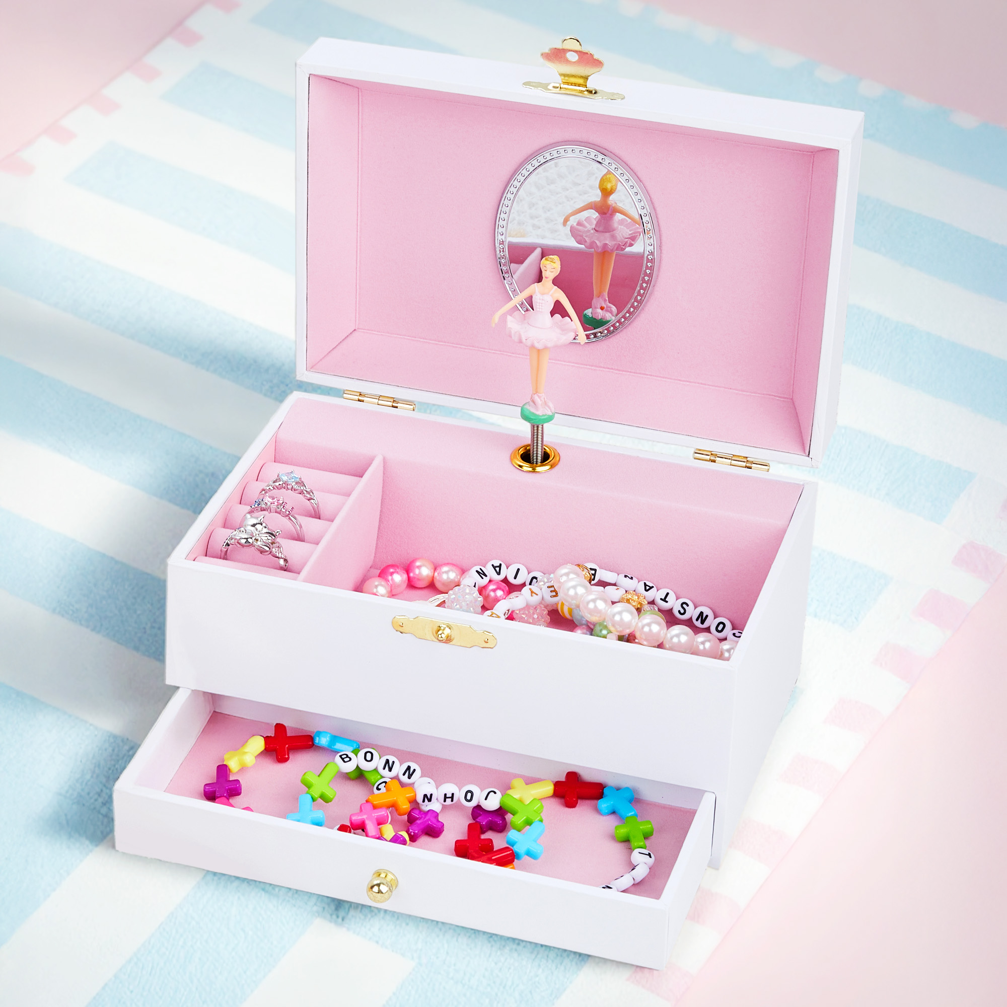 Two-Layer & Ballerina Design - This jewelry box brings a classic ballerina theme to life with a soft pastel look, a twirling dancer inside, and two layers of storage that help little girls keep their tiny treasures neat and easy to find.